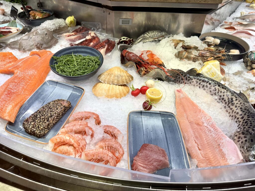 サーモンやマグロ、エビ、ホタテ、タコ、カレイ、あさり、パンガシウスまで、南ドイツのスーパーではなかなか見かけない魚介類が揃っています。