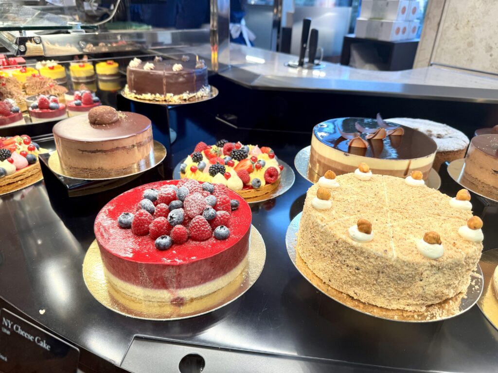 冷蔵ケースには色とりどりのケーキやカップ入りムース、ティラミスなどが並び、見た目も美しく、思わず写真を撮りたくなるほど。