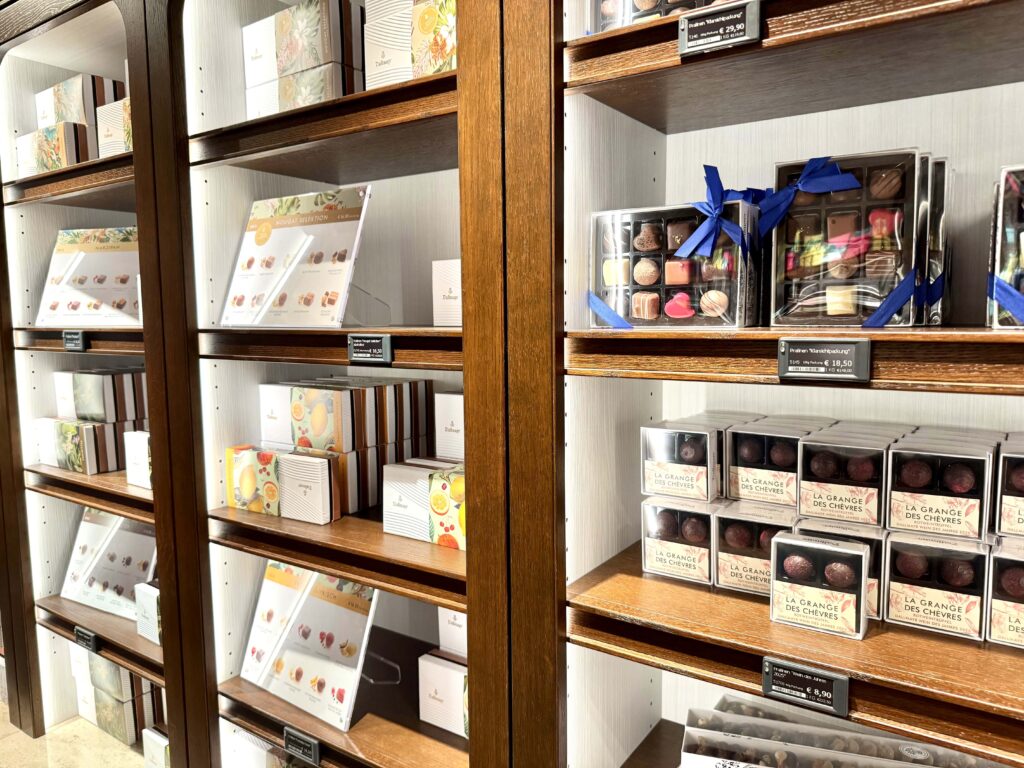高級プラリネや板チョコレートが種類豊富に並び、贈答用の美しい箱入りもあれば、1個単位で購入可能なものもあります。