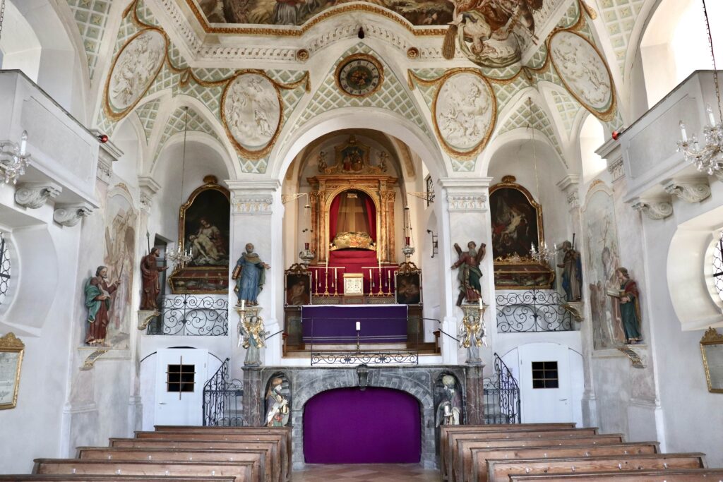 バロック様式の内部は明るく華やかで、見事な装飾が施されており、この町を訪れる観光客をも優しく包み込みます。