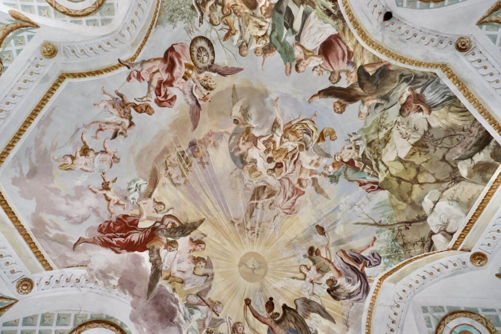 教会内部は、広くないものの華やかであり、特に天井の迫力あるフレスコ画が印象的です。